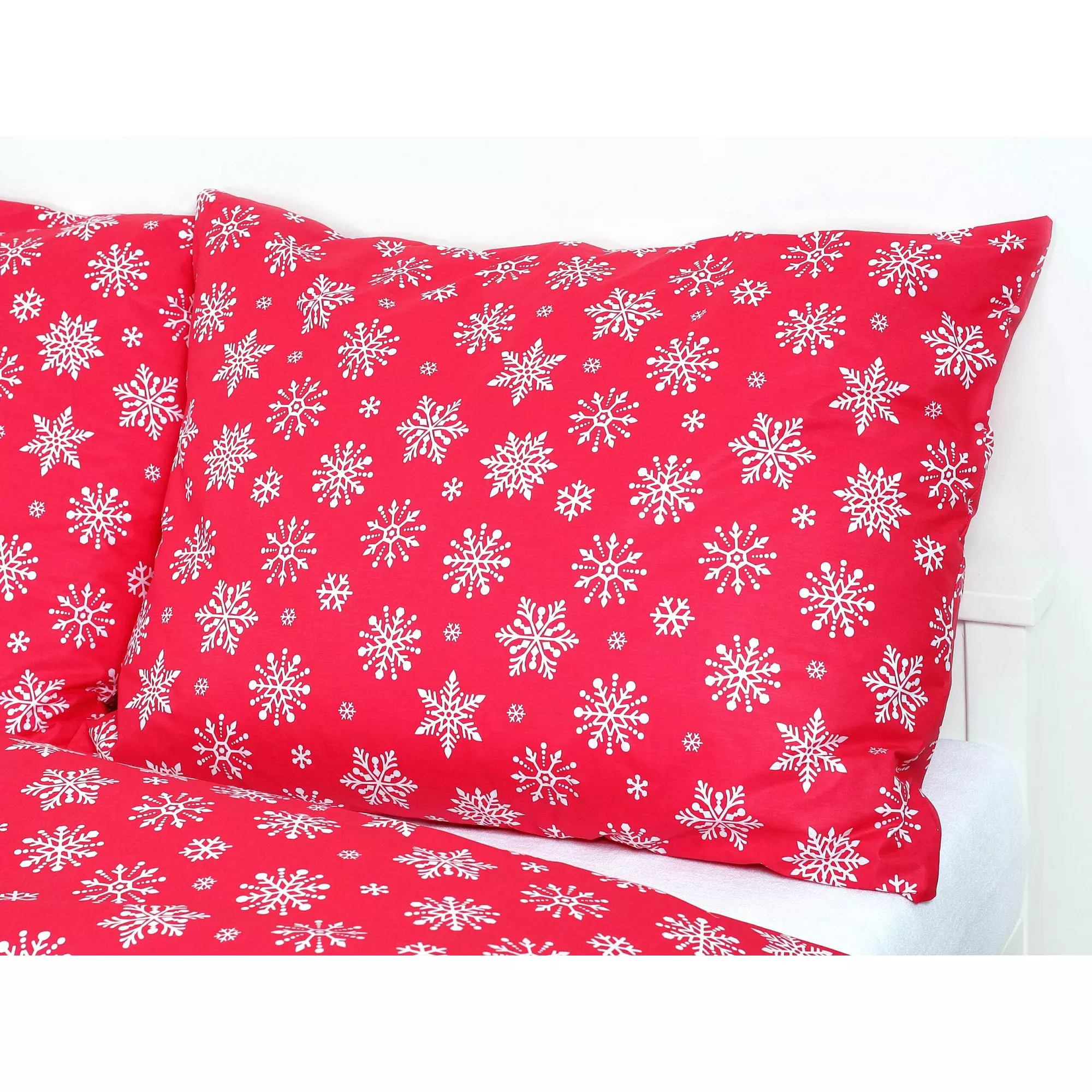 Motiv bílých vloček na červeném pozadí přidává povlečení skvělý šarm.