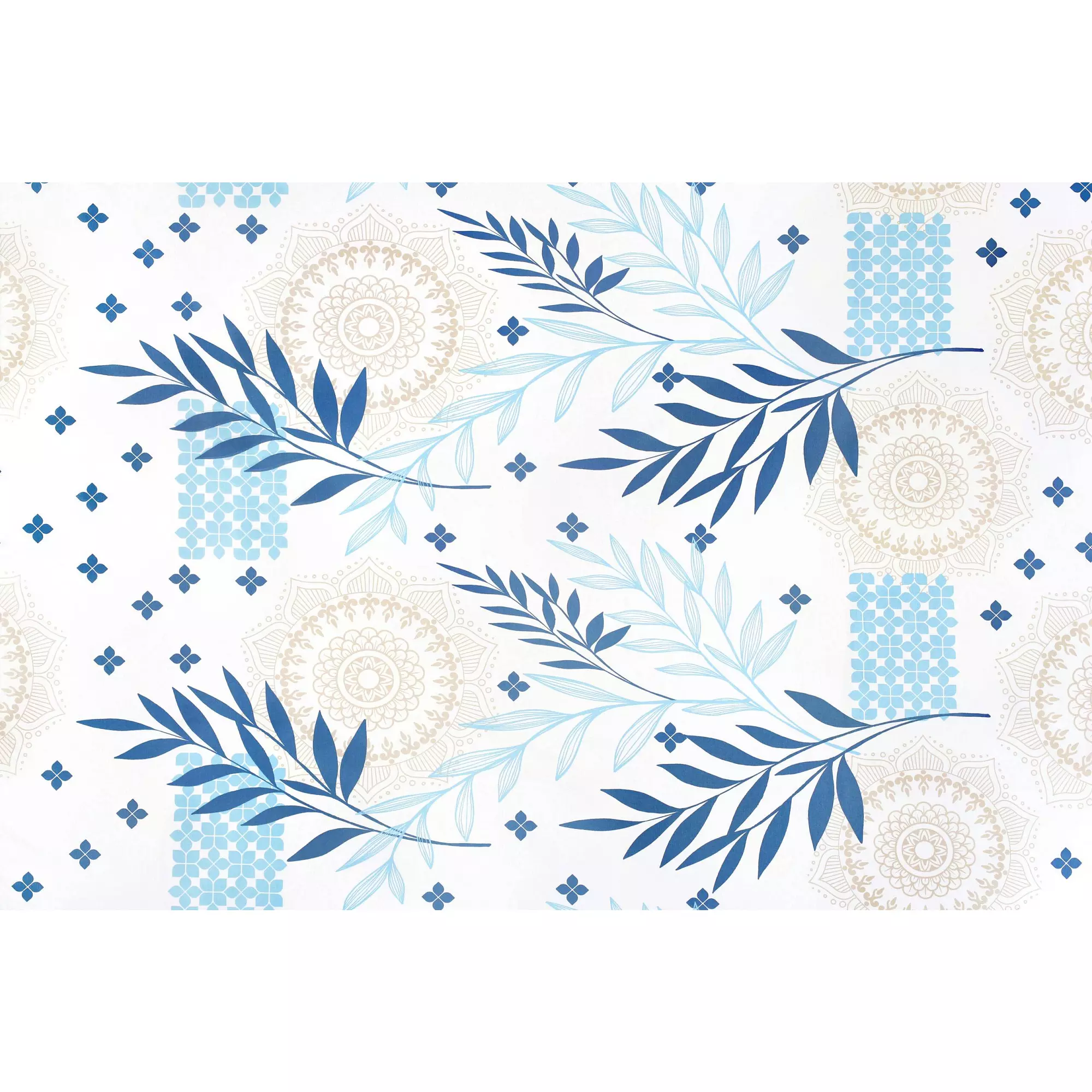 Motiv modrých listů a béžových mandal na bílém pozadí přidává povlečení skvělý šarm.