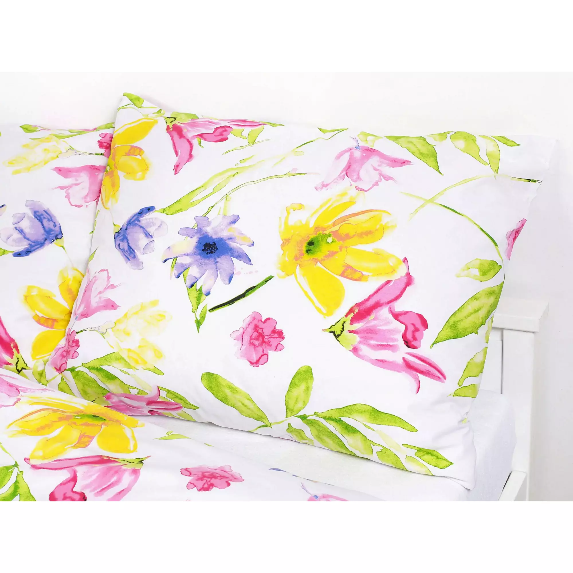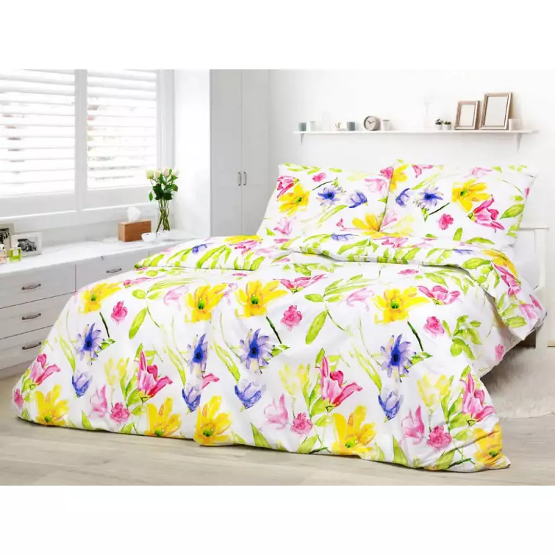 Motiv žlutých květů s růžovými tulipány na bílém pozadí přidává povlečení skvělý šarm.
